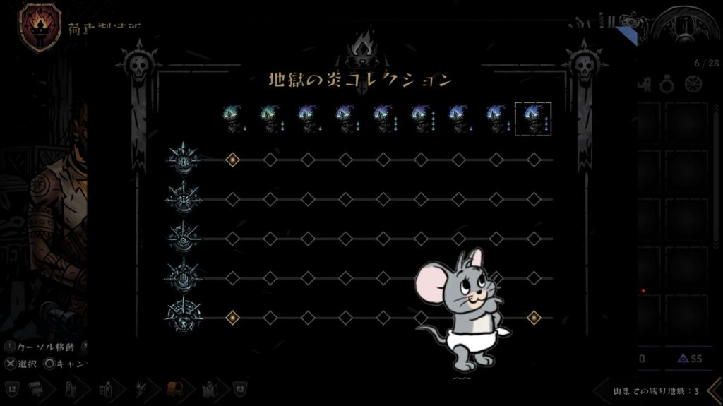 ただ地獄の炎ならどれでも良いわけではなく、1番最後に手に入れられる「地獄の闇火」が対象になり、装備した状態でのステージ5臆病のエンドボス撃破になります。
